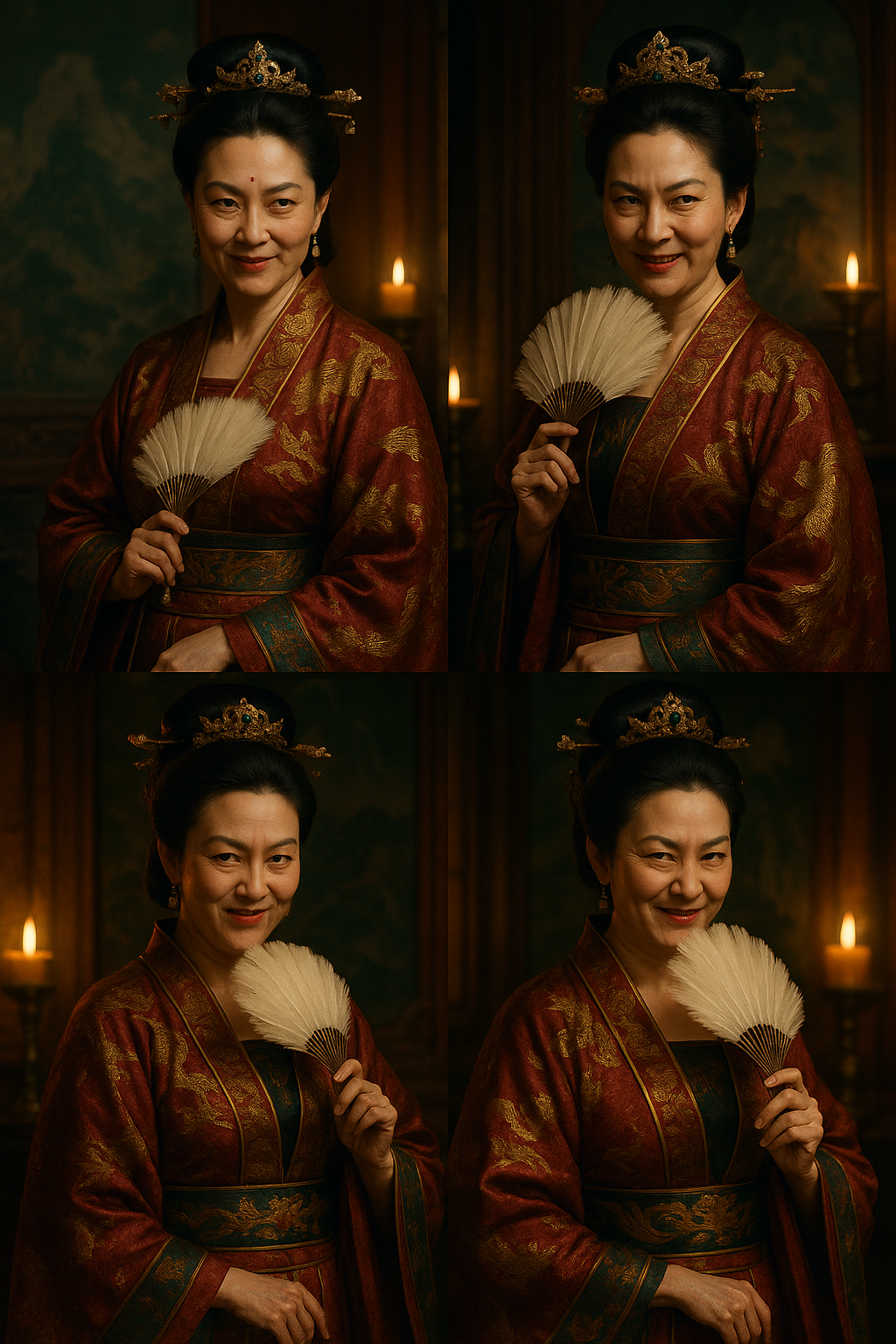 描述主题精确:五十岁古蜀国女子,身处蜀山密林古殿之中,身着华丽蜀锦,面容虽保养得体却隐藏着岁月痕迹,眉眼间透着虚情假意的冷漠与算计。她站在精致的青铜镜前,假意施粉描眉,实则眼神凌厉如刃,背后可见铜雀飞檐与云雾缭绕,环境氛围神秘肃杀,仿佛暗藏一场宫廷权谋。她的手指抚着一柄匕首,象征她的野心与冷酷。整个画面呈现出东方历史剧的厚重感与紧张气氛