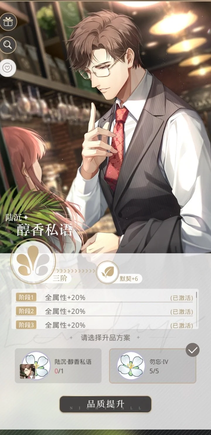 因为我有一百张“游览券”,然后我使用“信使巡游”后,不停抽到重复卡,三星的五阶卡有5张以上,大部分新抽中的又都是三星重复卡,所以可以不断回收,在商场中兑换到灵犀-拾光之星,就可以购买勿忘!还可以兑换“月之时光”,又能将四星卡升级为五星卡,一切发展相当顺利,目前剧情进行到14章。。